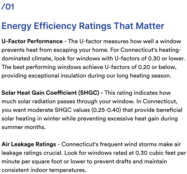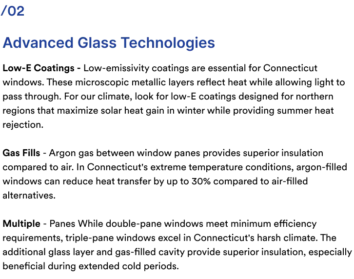 During Connecticut's heating season, your windows should minimize heat loss while maximizing beneficial solar gain. South-facing windows can contribute significant passive solar heating, reducing heating costs when properly selected.